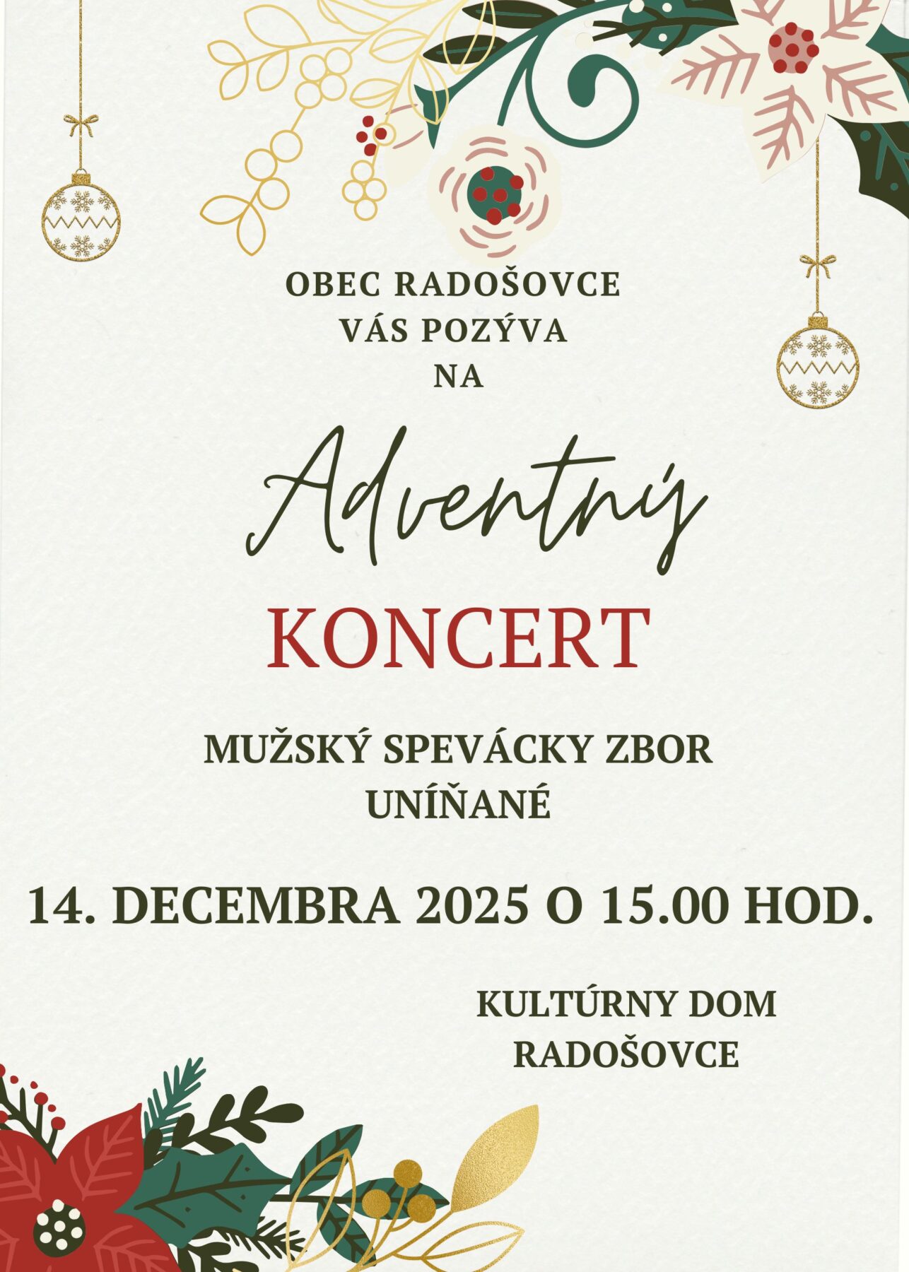 Obec Radošovce pozýva všetkých na adventný koncert Mužského speváckeho zboru Uňíňané, ktorý sa uskutoční 3.adventnú nedeľu 14.12.2025 o 15.00 hod. v KD Radošovce.
